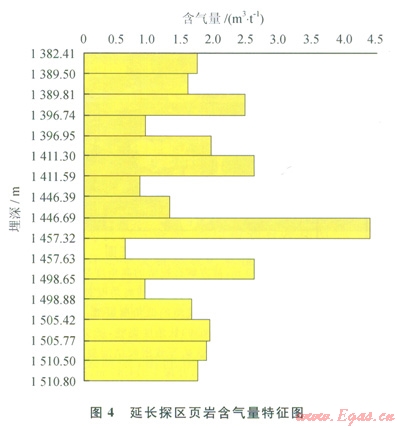 與常規(guī)天然氣類似,要構(gòu)成一定的儲(chǔ)量規(guī)模,頁巖氣必須具備充足的氣源條件,但這并不意味著其氣源條件狹窄,對(duì)地質(zhì)、地球化學(xué)等指標(biāo)仍有定量上的要求。在頁巖規(guī)模確定的前提下,含氣量的大小是決定探區(qū)是否具有商業(yè)開采價(jià)值的關(guān)鍵。含氣量的大小一方面受控于儲(chǔ)集空間的發(fā)育程度,另一方面受控于烴源巖的生氣能力,而最終決定頁巖生氣能力的是有機(jī)質(zhì)的豐度、類型和成熟度。有機(jī)質(zhì)的豐度、類型和成熟度在一定程度上具有生氣互補(bǔ)性,例如腐泥型母質(zhì)在熱演化程度較低時(shí)也可以生氣,而腐殖型母質(zhì)在高演化程度下才可能生成同等的氣量[3]。同理,含氣量的大小是各種地球化學(xué)參數(shù)指標(biāo)綜合作用的結(jié)果。延長探區(qū)內(nèi)1井與2井具有相同的母質(zhì)類型(以混合型為主),但l井的有機(jī)碳含量為2.2%,鏡質(zhì)體反射率為0.88%,孔隙度為0.25%;而2井的有機(jī)碳含量為3.9%,鏡質(zhì)體反射率為1.0l%,孔隙度為0.11%,孔隙度極小。然而,2口井頁巖的含氣量卻大致相當(dāng)(均接近3.5m3t)。由此可見,地球化學(xué)指標(biāo)上的差異并不代表頁巖整體含氣性的差異,當(dāng)某個(gè)地球化學(xué)指標(biāo)條件差時(shí),若其他指標(biāo)較好仍可能具有可觀的含氣量。因此,在進(jìn)行頁巖氣地質(zhì)評(píng)價(jià)時(shí),不能采用單一的地球化學(xué)指標(biāo)來進(jìn)行判別。