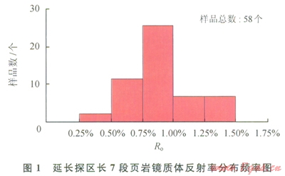 延長探區(qū)長7段頁巖埋深變化大(5001800m)、構(gòu)造演化歷史和熱作用歷史存在差異,其現(xiàn)今的熱成熟度變化亦較大。長7段頁巖的鏡質(zhì)體反射率變化范圍為0.25%~l.50%,基本上涵蓋了生物作用生甲烷氣、熱降解作用生油氣和高溫?zé)崃呀馍鷼?span lang="EN-US">3個(gè)生烴階段,但以熱降解作用階段為主(1)。因此,從成因類型上看,長7段頁巖氣包括生物作用成因、熱降解成因和高溫?zé)崃呀獬梢?span lang="EN-US">3種類型。