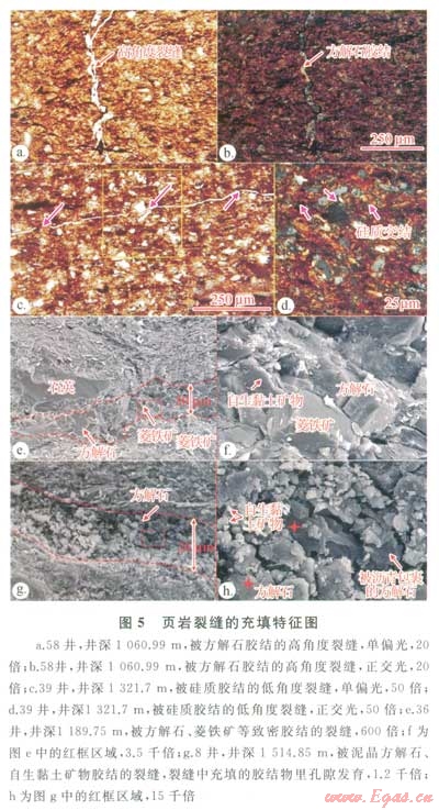 頁巖不但是頁巖氣的烴源巖和儲(chǔ)層,超低的孔滲性還使得頁巖可成為頁巖氣的蓋層[13-14]。但這并非表明頁巖氣的賦存對(duì)蓋層條件沒有嚴(yán)格要求。在孔滲條件較優(yōu)越地區(qū),蓋層條件可能是需要上覆蓋層。例如美國的Barnett頁巖其上覆蓋層為石灰?guī)r[10]。對(duì)于孑L滲條件差但裂縫發(fā)育的地區(qū),蓋層條件則是裂縫需要被充填。以長7段頁巖為例,部分頁巖裂縫極其發(fā)育,但裂縫并沒有破壞其含氣性,原因在于一些裂縫被高度充填,阻止了氣體的二次運(yùn)移。長7段頁巖的裂縫膠結(jié)物包括方解石膠結(jié)物(正交光下顯示高級(jí)干涉色,圖5-a5-b)和硅質(zhì)膠結(jié)物(正交光下顯示一級(jí)灰干涉色,圖5-c5-d)。被嵌晶連晶方解石或硅質(zhì)膠結(jié)物充填的裂縫較致密、結(jié)晶較大、晶形完整,膠結(jié)礦物主要為碳酸鹽類,以方解石為主,局部見菱鐵礦,可見自生黏土礦物充填晶間縫(5-e、5-f)。被泥晶方解石和黏土礦物充填的裂縫較疏松,膠結(jié)物中發(fā)育晶間孔孔隙,泥晶方解石膠結(jié)物大小介于510mm,自生黏土礦物晶體大小介于l2mm(5-g、5-h)。
