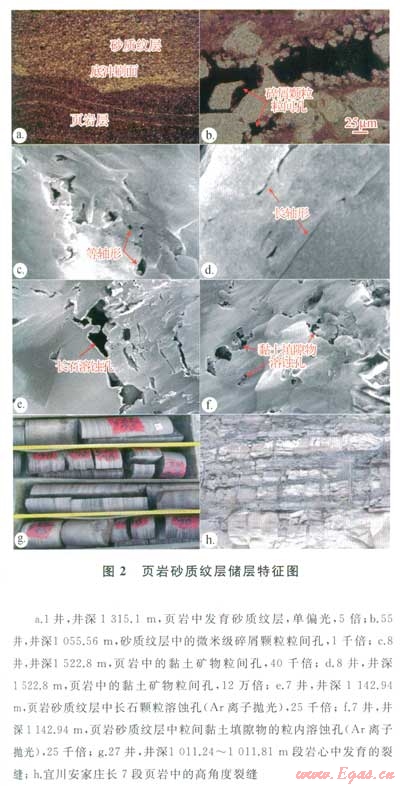 砂質(zhì)紋層廣泛發(fā)育原生粒間孔和次生溶蝕孔。原生粒間孔主要是碎屑顆粒粒間孔與黏土礦物粒間孔。碎屑顆粒粒間孔在砂質(zhì)紋層中極為常見,該類孔隙的孔隙形態(tài)多呈不規(guī)則的多邊形,直徑以微米級(jí)至幾十微米為主(大孔級(jí))(2-a2-b)。黏土礦物粒間孔是黏土礦物(主要是伊利石與綠泥石)圄成的孔隙空間,掃描電鏡下常見長軸形和等軸形2種形態(tài)(2-c、2-d)。長軸形由于壓實(shí)的影響而呈狀,其孔徑大小可達(dá)數(shù)十納米(中孔級(jí)),一般沿黏土礦物層理呈定向分布;等軸形是黏土礦物顆粒在強(qiáng)水動(dòng)力環(huán)境堆積而成的粒間孔,或者是黏土絮凝物在靜水環(huán)境殘留下來的殘余孔(一般為大孔級(jí)),分布較雜亂。次生溶蝕孔一般發(fā)育在長石及碎屑顆粒的粒間填隙物內(nèi)(2-c、2-f),包括粒間孔、粒內(nèi)孔和鑄??祝粤ig孔為主。粒間孔形態(tài)各異,常見港灣狀溶蝕邊緣,直徑以數(shù)十至數(shù)百納米為主(中孔級(jí));粒內(nèi)孔多納米級(jí)(小孔級(jí));鑄??装w粒間易溶物鑄模和顆粒鑄模,孔徑變化較大。砂質(zhì)紋層還發(fā)育構(gòu)造裂縫,裂縫面比較粗糙,以高角度縫為主,產(chǎn)狀不穩(wěn)定(2-g、2-h)。