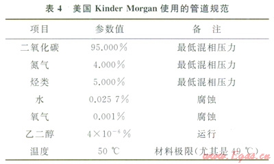 日前運(yùn)行的管道中所輸送的CO2混合物及對(duì)純度和含水量的規(guī)定等都不盡相同。國際上對(duì)于管道系統(tǒng)輸送CO2混合氣體的組成要求沒有統(tǒng)一的標(biāo)準(zhǔn)。混合氣體的組成要求很大程度上取決于設(shè)計(jì)階段進(jìn)行的評(píng)估,包括流動(dòng)安全、管道完整性、安全性及終端用戶對(duì)CO2純度的需求。美國Kinder Morgan使用的管道規(guī)范見表4[12]。
