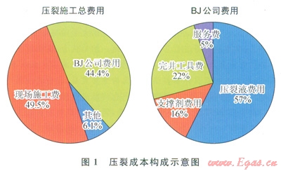 眾所周知,非常規(guī)油氣開發(fā)的經濟效益取決于成本的控制,北美取得頁巖氣開發(fā)的成功正是由于采用了低成本的清水壓裂[4]。但以勝利油田某非常規(guī)頁巖油氣井的壓裂開采預算為例(圖1),不難看出,國外公司的完井工具、壓裂材料(壓裂液和支撐劑)以及技術服務費用占據全部壓裂費用的44.4%,其中,壓裂液的費用又占BJ公司全部預算的57%。兇此,目前的非常規(guī)油氣開發(fā)模式難以取得經濟效益,從長遠角度出發(fā),必須要有大量的資金和科研力量投入到非常規(guī)油氣開采的基礎研究上,從完井工具、壓裂液和支撐劑以及相關技術上打破國外技術壟斷。提升壓裂開采的軟件實力,才能有效控制開發(fā)成本,取得并提高經濟效益。