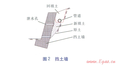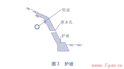 a.如果地貌允許(如荒地),首先進行分階削方處理,使管道通過處的坡度≤30°;其次在有可能產(chǎn)生積水或高跌水的位置,考慮設(shè)置漿砌塊石截水墻(見圖l)、排水溝,將水疏導至遠離管道的地方,避免出現(xiàn)漏斗、溶洞以及對管溝產(chǎn)生沖蝕。