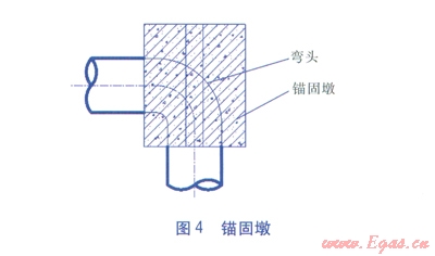 c.無論按照上述a或b哪種情況處理后,都還需要根據(jù)坡長及管徑設(shè)置錨固墩(見圖4),一般坡長>25m時,坡腳用素混凝土或灰土墩將彎頭錨固,坡長>35m時,除下部彎頭錨固以外,陡坡上每隔15~20m采用錨桿固定,錨桿深度應在原土或基巖中。
