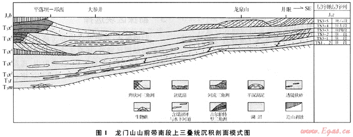龍門山崛起之后,在山前發(fā)育前陸盆地型沉積,劃為構(gòu)造層序三。前陸盆地的剖面形態(tài)為西陡東緩的箕形盆地。因而沖積、濁積型的扇三角洲或辮狀河三角洲及湖成三角洲砂體分布區(qū)是區(qū)內(nèi)的主要有利相帶和砂體類型。