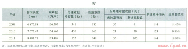 現(xiàn)取近3年6家燃?xì)夤竟芫W(wǎng)及違章數(shù)據(jù)統(tǒng)計(jì),見(jiàn)表1。
