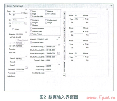 在應(yīng)用CAESARⅡ軟件計(jì)算時(shí),首先需要對管道進(jìn)行節(jié)點(diǎn)的選擇和編號;接著輸入數(shù)據(jù),輸入的數(shù)據(jù)按其特性不同分為管道元件結(jié)構(gòu)特征參數(shù)、基本參數(shù)和邊界條件3種類型。管道元件結(jié)構(gòu)特征參數(shù)主要是指管道元件的形狀、結(jié)構(gòu)特征等,這類參數(shù)決定了管道的空間走向和相應(yīng)的管道元件的規(guī)格尺寸、特性?;緟?shù)主要是指管道元件的計(jì)算溫度、安裝溫度,管道材料特性(彈性模量、線膨脹系數(shù)、許用應(yīng)力、管材密度)以及管道尺寸(外徑、壁厚、長度)等。邊界條件主要是指管道元件的約束條件、附加位移及管道端點(diǎn)類型等。