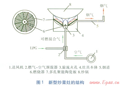新型炒菜灶主要工作原理為:空氣通過(guò)送風(fēng)機(jī)經(jīng)空氣管道進(jìn)入燃?xì)?/span>—空氣預(yù)混器,LPG通過(guò)開(kāi)設(shè)在預(yù)混器側(cè)壁上的小孔高速?lài)?/span>入與空氣初步混合。LPG與空氣再經(jīng)旋流火孔噴出后進(jìn)一步混合,使得可燃混合氣成一定角度旋流強(qiáng)烈燃燒,使得鍋底與火焰的接觸面積增大。高溫?zé)煔馔ㄟ^(guò)多孔聚能陶瓷板上的環(huán)形孔后排入煙道,陶瓷板積蓄了大量的煙氣余熱,可對(duì)鍋底進(jìn)行二次輻射加熱,實(shí)現(xiàn)了高溫?zé)煔獾挠酂峄厥绽谩?/span>
