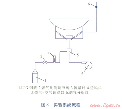 新型炒菜灶與傳統(tǒng)炒菜灶的實(shí)驗(yàn)系統(tǒng)基本一致。實(shí)驗(yàn)裝置包括LPG鋼瓶、煙氣分析儀、燃?xì)獗壤{(diào)節(jié)閥、流量計(jì)、電子溫度計(jì)等。煙氣分析儀用于測(cè)量煙氣中CO體積分?jǐn)?shù),燃?xì)獗壤{(diào)節(jié)閥用于調(diào)節(jié)控制LPG的流量,流量計(jì)用于計(jì)量LPG累計(jì)流量。實(shí)驗(yàn)系統(tǒng)流程見(jiàn)圖3。