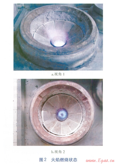 新型炒菜灶的結(jié)構(gòu)見(jiàn)圖1,火焰燃燒狀態(tài)見(jiàn)圖2。主要由燃?xì)庖豢諝忸A(yù)混器、灶具本體、燃燒器、扇形多孔聚能陶瓷板、送風(fēng)機(jī)等組成。燃燒器的內(nèi)壁開(kāi)有能使可燃混合氣旋流噴出的旋流火孔,方向?yàn)檩S向順時(shí)針傾斜15°并且切向傾斜向上15°,孔徑為2.5mm。