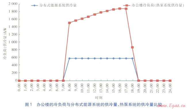 辦公樓在供冷期白天工作時段(800—1800)的平均冷負荷為1650kW,最大冷負荷為1879kW,最小冷負荷為869kW。夜冷負荷按0kW估算。辦公樓的冷負荷與分布式能源系統(tǒng)的供冷量、熱泵系統(tǒng)的供冷量比較見圖1(熱泵系統(tǒng)的供冷量與冷負荷一致)