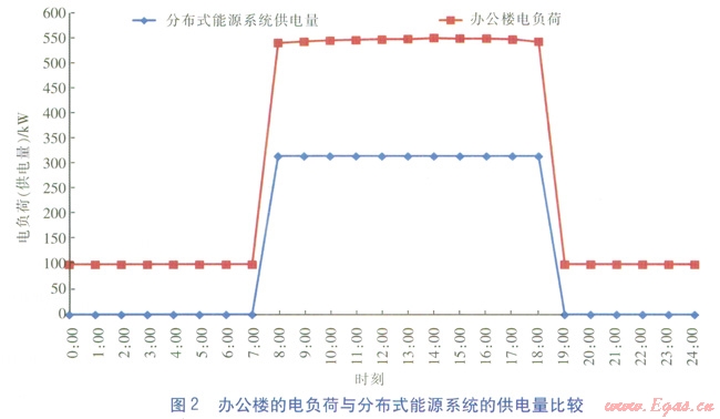 辦公樓白天工作時段(800—1800)的平均電負荷(不包括制冷用電負荷)546kW,非工作時間內(nèi)電負荷均按照100kW估算,辦公樓的電負荷與分布式能源系統(tǒng)的供電量比較見圖2