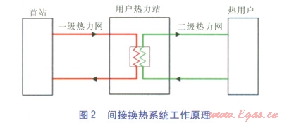 圖2中,一級(jí)熱力管網(wǎng)的高溫水和二級(jí)熱力管網(wǎng)的低溫水在用戶(hù)熱力站經(jīng)過(guò)換熱器間接換熱后供給熱用戶(hù)。而混水系統(tǒng)中(見(jiàn)圖l),一級(jí)熱力管網(wǎng)的高溫水和二級(jí)熱力管網(wǎng)的低溫水在用戶(hù)熱力站不經(jīng)過(guò)換熱器,而是直接混合后供給熱用戶(hù)。與間接換熱系統(tǒng)相比,混水系統(tǒng)更容易因?yàn)樗疁氐耐蝗簧叨a(chǎn)生氣體。