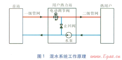 隨著能源和環(huán)境問(wèn)題日益突出,節(jié)能和環(huán)保引起全球關(guān)注,成為人類(lèi)社會(huì)生存和發(fā)展的兩大主題?;焖到y(tǒng)作為一種更加節(jié)能的供熱方案,得到了日益廣泛的應(yīng)用?;焖到y(tǒng)工作原理見(jiàn)圖1,將一級(jí)管網(wǎng)的高溫水和二級(jí)管網(wǎng)的低溫水在用戶(hù)熱力站不經(jīng)過(guò)換熱器按比例直接混合后供給熱用戶(hù)。