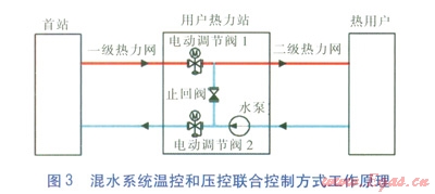 混水系統(tǒng)溫控和壓控聯(lián)合控制方式工作原理見(jiàn)圖3,在一級(jí)熱力管網(wǎng)供水管上設(shè)置壓力控制的電動(dòng)調(diào)節(jié)閥1,在一級(jí)熱力管網(wǎng)回水管上設(shè)置溫度控制的電動(dòng)調(diào)節(jié)閥2。壓力控制是通過(guò)檢測(cè)二級(jí)熱力管網(wǎng)回水壓力,來(lái)調(diào)節(jié)一級(jí)熱力管網(wǎng)供水管上的電動(dòng)調(diào)節(jié)閥1開(kāi)度,使二級(jí)熱力管網(wǎng)回水壓力滿(mǎn)足所供小區(qū)基本的定壓要求。當(dāng)二級(jí)熱力管網(wǎng)的回水壓力低于該用戶(hù)熱力站所需的定壓值時(shí),電動(dòng)調(diào)節(jié)閥1開(kāi)度增大;當(dāng)二級(jí)熱力管網(wǎng)的回水壓力高于該用戶(hù)熱力站所需的定壓值時(shí),電動(dòng)調(diào)節(jié)閥1開(kāi)度減小。溫度控制的電動(dòng)調(diào)節(jié)閥2通過(guò)檢測(cè)二級(jí)熱力管網(wǎng)供水溫度是否滿(mǎn)足設(shè)定值來(lái)調(diào)節(jié)開(kāi)度,當(dāng)二級(jí)熱力管網(wǎng)的供水溫度低于設(shè)定值時(shí),增大電動(dòng)調(diào)節(jié)閥2開(kāi)度;反之,減小電動(dòng)調(diào)節(jié)閥2開(kāi)度。通過(guò)溫控和壓控聯(lián)合控制的方式,一方面穩(wěn)定了混水系統(tǒng)的壓力,杜絕氣體由于壓力波動(dòng)而析出;另一方面也滿(mǎn)足了溫度控制的要求。