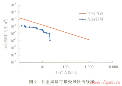 歐美等一些國家和石油天然氣企業(yè)已經(jīng)建立有自己的風(fēng)險可接受標準。我國于2011年國家安全生產(chǎn)監(jiān)督管理總局頒布了《危險化學(xué)品重大危險源監(jiān)督管理暫行規(guī)定》,制定了危險化學(xué)品重大危險源的風(fēng)險可接受標準,除此以外沒有一個統(tǒng)一的或行業(yè)的風(fēng)險可接受標準。因此,筆者所在公司自2009年就開展了高含硫氣田開發(fā)風(fēng)險可接受標準的研究,并提出了公眾個人風(fēng)險標準(0.8×10-4),員工個人風(fēng)險(1.5×10-3)和社會風(fēng)險[1.4×10-3(N=1),斜率取-1]基準值以供參考。