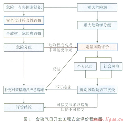 選擇含硫氣田開發(fā)工程安全評價方法需有針對性,含硫氣田開發(fā)工程安全評價程序見圖1。重點突出含硫氣田開發(fā)工程的安全設(shè)汁符合性評價、定量風(fēng)險評價以及事故發(fā)生后的減輕和應(yīng)急措施。