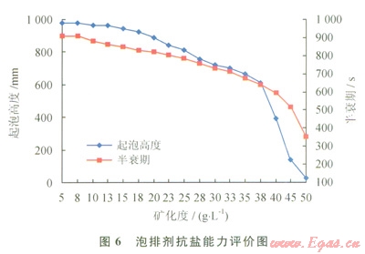 水的礦化度對(duì)泡排劑的起泡性能具有決定性的影響。在90℃溫度的水浴鍋中,測(cè)試在泡排劑加量為0.3%時(shí)不同礦化度的礦化水的起泡性能(圖6)。
