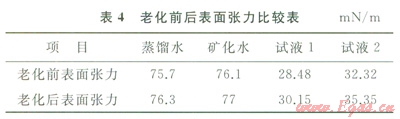 由表4數(shù)據(jù)分析可知,老化前后試液的表面張力變化不大,說(shuō)明泡排劑的熱穩(wěn)定性比較好。