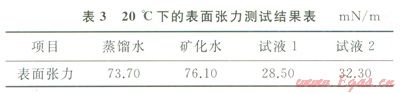 參考標(biāo)準(zhǔn)SY/T5370—1999配制礦化水(稱取10g氯化鈣和40g氯化鈉,用蒸餾水于燒杯中溶解,并用蒸餾水沖洗3次,沖洗液全部轉(zhuǎn)入該容量瓶中,加蒸餾水至總體積1000mL,得到礦化度50g/L的礦化水)、試液1(0.3%蒸餾水泡排劑溶液)、試液2(0.3%礦化水泡排劑溶液)。分別測(cè)定蒸餾水、礦化水、試液1、試液2的表面張力(表3)。