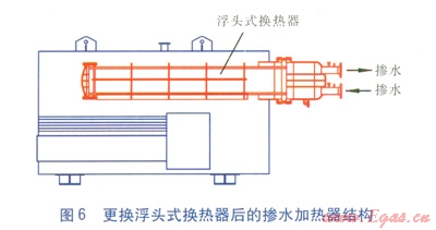 將原加熱盤管拆除(見圖4),更換成浮頭式換熱器(見圖5)。改造完畢后,按要求試壓。1臺摻水加熱爐安裝1臺浮頭式換熱器,另制造1臺浮頭式換熱器作為3臺摻水加熱爐的備用換熱器。當(dāng)某臺浮頭式換熱器結(jié)垢嚴(yán)重,需要清垢時(shí),先停爐拆下該浮頭式換熱器,更換上備用換熱器,然后摻水加熱爐繼續(xù)運(yùn)行,從而減輕對正常運(yùn)行的影響。更換浮頭式換熱器后的摻水加熱器結(jié)構(gòu)見圖6。