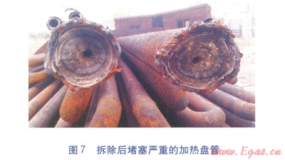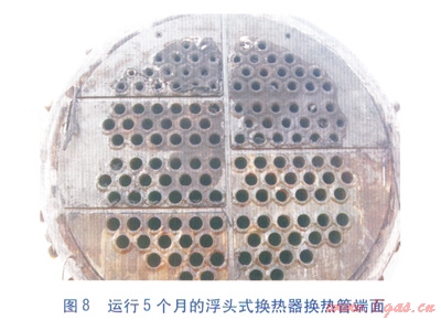 3臺摻水加熱爐于2012年10月陸續(xù)改造完成,并同期投產(chǎn)運(yùn)行。改造后的3臺加熱爐運(yùn)行情況基本平穩(wěn),直至2013年3月才陸續(xù)出現(xiàn)換熱效率低的現(xiàn)象。原加熱盤管基本兩個(gè)月就需要酸洗一次,酸液對金屬的腐蝕性強(qiáng),易揮發(fā)產(chǎn)生酸霧污染原油,降低管道及設(shè)備的使用壽命[1]。而且隨著運(yùn)行時(shí)間的延長,酸洗的次數(shù)增加,加熱盤管內(nèi)壁結(jié)垢傾向越來越嚴(yán)重,酸洗也變得無能為力。而改造后的浮頭換熱器能夠通過機(jī)械通洗繼續(xù)使用,清洗周期也比原加熱盤管有所延長。拆除后堵塞嚴(yán)重的加熱盤管見圖7,運(yùn)行5個(gè)月的浮頭式換熱器換熱管端面見圖8。實(shí)踐充分證明,采用浮頭式換熱器替代蛇形加熱盤管,內(nèi)壁涂覆防垢涂層并提高摻水流速,有效地延緩了清洗時(shí)間。浮頭式換熱器可抽出,方便清洗,確保了原油正常生產(chǎn)。