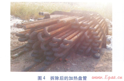 污垢樣品的化學(xué)分析結(jié)果表明,污垢主要為含油性碳酸鈣等鹽類污垢,并含有少量泥沙。對摻水進(jìn)行檢測后發(fā)現(xiàn),水中油質(zhì)量濃度達(dá)70~150mg/L,還含有少量的泥沙。當(dāng)含油摻水在加熱盤管內(nèi)溫度不斷升高后,極易在加熱盤管內(nèi)壁形成污垢,造成加熱盤管管壁熱阻加大,介質(zhì)流動阻力增大,最終嚴(yán)重堵塞盤管,導(dǎo)致加熱爐無法正常運(yùn)行。采用酸液清洗后,雖然加熱盤管的換熱能力有所提升,但由于加熱盤管內(nèi)摻水實(shí)際流速低(低于0.5m/s),且酸洗造成盤管內(nèi)表面粗糙,易結(jié)垢的因素并未消除,因此很快再次出現(xiàn)換熱效率下降的問題。
