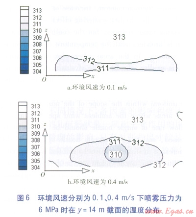 環(huán)境風(fēng)速分別為0.1、0.4ms下,噴霧壓力為6MPa時(shí)在z=1.5m截面及y=14m截面的溫度分布見(jiàn)圖5、6。環(huán)境風(fēng)速為0.1ms時(shí),z=1.5m截面上降溫區(qū)域集中,其他區(qū)域降溫幅度僅0.51.0Ky=1.4m截面上空氣溫度幾乎沒(méi)有被影響。環(huán)境風(fēng)速為0.4ms時(shí),降溫12K的范圍變大,降溫區(qū)域分布更均勻,在y=14m截面上出現(xiàn)13K的溫降,并且處在人員可感知的高度上。