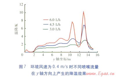 在環(huán)境風(fēng)速為0.4ms,噴霧壓力為6MPa的條件下,增加單個(gè)噴嘴的流量進(jìn)行模擬,對(duì)比3種噴嘴流量(3.0、4.56.0Lh)下,x=4m截面上。z=1.5m處在y軸方向上產(chǎn)生的降溫效果,見(jiàn)圖7。