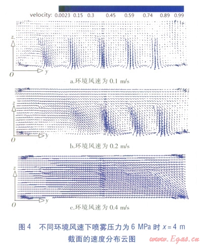 不同環(huán)境風(fēng)速下,噴霧壓力為6MPa時(shí)x=4m截面的溫度、速度分布云圖分別見(jiàn)圖3、4。由圖3、4可知,在來(lái)流空氣與噴霧引起的氣流的綜合作用下,環(huán)境風(fēng)速不同時(shí)模型空間呈現(xiàn)出不同的溫度、速度分布。