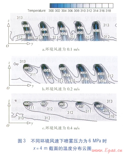 模擬結(jié)果顯示,在相同環(huán)境風(fēng)速下,3種噴霧壓力的降溫范圍與降溫幅度沒(méi)有明顯差別,說(shuō)明在模擬的噴霧壓力范圍內(nèi),噴霧壓力對(duì)降溫效果的影響很小,不如環(huán)境風(fēng)速對(duì)降溫效果的影響明顯。