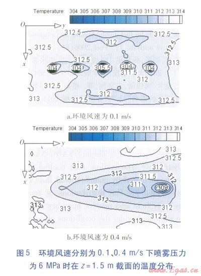 模擬結(jié)果顯示,在相同環(huán)境風(fēng)速下,3種噴霧壓力的降溫范圍與降溫幅度沒(méi)有明顯差別。說(shuō)明在模擬的噴霧壓力范圍內(nèi),噴霧壓力對(duì)降溫效果的影響很小,不如環(huán)境風(fēng)速對(duì)降溫效果的影響明顯。因此可適當(dāng)降低噴霧壓力,以提高噴霧系統(tǒng)運(yùn)行的經(jīng)濟(jì)性。