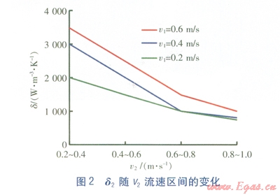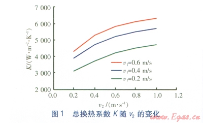 V1分別為0.2、0.4、0.6ms時,由式(1)計算得到的總換熱系數(shù)K隨穢:的變化見圖1。由圖1可知,當v1一定時,總換熱系數(shù)Kv2的增大而增大,但增大的幅度在減小。