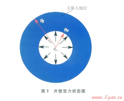 “地層 井眼”模型如圖5。地層可看作是半徑無窮大的圓,由圣維南原理[22]可知:無窮大地層半徑遠(yuǎn)大于井眼半徑,因此由井壁應(yīng)力對無窮遠(yuǎn)處的總應(yīng)力擾動(dòng)是很小的,可以不計(jì)。由于水泥漿未凝固,故井壁僅受水泥漿液柱壓力(qo)的內(nèi)壓作用。