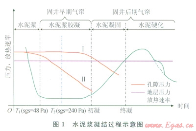 隨著水化反應(yīng)的進(jìn)行,液態(tài)水泥漿逐漸凝固成固態(tài)水泥石需經(jīng)歷液相、膠凝、凝固和硬化等4個(gè)階段[15](圖1)。液態(tài)水泥漿能夠完全傳遞孔隙壓力,不會發(fā)生氣竄;膠凝態(tài)水泥漿不斷形成膠凝結(jié)構(gòu),發(fā)生塑性體積收縮,引起孔隙壓力逐漸降低;初凝后,水泥漿進(jìn)入凝固、硬化階段,表現(xiàn)出固態(tài)特征,滲透率極低,能有效阻止水泥環(huán)本體氣竄[16-17]。南上述研究分析可知,固井早期氣竄包括兩個(gè)階段:靜膠凝強(qiáng)度過渡時(shí)間(T1至T2);靜膠凝強(qiáng)度過渡時(shí)間結(jié)束時(shí)刻至初凝(T2至初凝)。