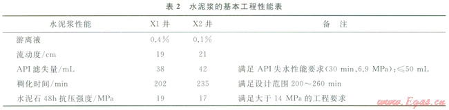 已知X區(qū)塊兩口天然氣井Xl和X2。XJ井:Æ177.8mm(內(nèi)徑157.1mm)油層尾管下深5085m,井眼直徑215.9mm,鉆井液密度為2.30g/cm3,采用高密度(2.35g/cm3)水泥漿固井,水固比0.263,封固井段4400~5085m,水泥漿實(shí)驗(yàn)設(shè)計(jì)溫度為110℃;X2井:Æ127mm油層尾管懸掛固井,井眼直徑149.2mm,鉆井液密度為2.10g/cm3,采用密度為2.13g/cm3水泥漿固井,水固比0.364,封固井段4862~5731m,水泥漿實(shí)驗(yàn)設(shè)計(jì)溫度為120℃。已知該區(qū)地層壓力梯度為0.0225MPa/m,油層套管彈性模量為206.9GPa、泊松比0.3,地層巖石彈性模量為13.84GPa、泊松比0.287。X1、X2兩井水泥漿基本工程性能滿足現(xiàn)場施工要求(表2)。