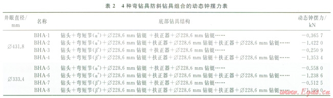 塔里木山前高陡構(gòu)造井斜控制[7]是空氣鉆井難題之一,空氣錘防斜技術(shù)[8]難以奏效,基于鉆具動力學(xué)特性分析,提出一種“彎鉆具動力學(xué)防斜技術(shù)”[9-10],對4種不同鉆具組合的動態(tài)鐘擺力進(jìn)行了分析,優(yōu)選出Æ431.8mm和Æ333.4mm井眼的“彎短節(jié)+雙扶正器”的動力學(xué)防斜鉆具組合(表2),其底部鉆具組成為:鉆頭+彎短節(jié)(a°)+Æ228.6mm鉆鋌+扶正器+Æ228.6mm鉆鋌+扶正器+Æ228.6mm鉆鋌……