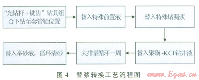 該轉(zhuǎn)換用鉆井液體系的組成為:①特殊前置液,配方:油基潤濕反轉(zhuǎn)劑+柴油+氧化瀝青粉,利用油基潤濕反轉(zhuǎn)劑特性,改變巖石表面性質(zhì),變親水表面為憎水表面,阻止水分進(jìn)入地層,防止井壁坍塌。②特殊堵漏漿,通過鉆井液中加入適量無滲透、聚合醇、陽離子乳化瀝青等處理劑來實(shí)現(xiàn)鉆井液的防漏作用。③含油聚磺一KCl鉆井液,具有“二強(qiáng)二高一低”特征。④舉砂液,建立井筒循環(huán)之后清潔井眼所用,通過高密度、高黏度的特點(diǎn)充分?jǐn)y帶井筒巖屑。形成了一套適合塔里木山前礫石層地質(zhì)特征的鉆井液轉(zhuǎn)換工藝技術(shù)(圖4),保障安全實(shí)施。