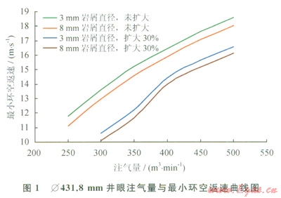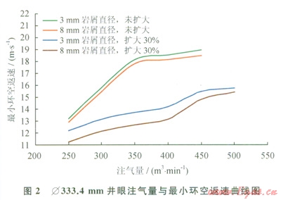 采用最小動能法判斷標(biāo)準(zhǔn):l]確定合理灃氣量,該方法認(rèn)為:當(dāng)環(huán)空空氣最小返速不小于15.24m/s時(shí),能將井底產(chǎn)生的巖屑攜帶至地面。根據(jù)實(shí)際鉆屑情況,模擬計(jì)算了Æ431.8mm和Æ333.4mm兩種井眼尺寸,考慮不同井眼擴(kuò)大率,不同巖屑顆粒尺寸條件下的最小環(huán)空返速,參照最小動能法判斷標(biāo)準(zhǔn),確定出合理注氣量(表1,圖1、2)。