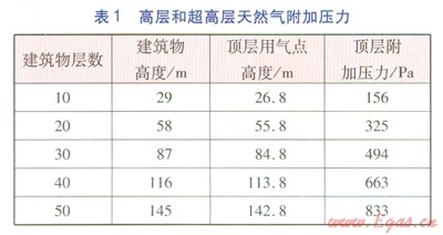 根據(jù)式(1),住宅層高按2.9m計(jì)算,對(duì)高層或超高層住宅,使用天然氣時(shí)的附加壓力計(jì)算結(jié)果見(jiàn)表1(頂層用氣點(diǎn)高度按樓板高度加0.7m計(jì))。