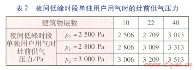 根據(jù)式(4),居民用氣中—低壓調(diào)壓設(shè)施出口壓力p2分別為2500、2800、3000Pa時(shí),在夜間低峰時(shí)段,僅有某戶居民用氣時(shí),其燃具前供氣壓力計(jì)算結(jié)果見(jiàn)表2。