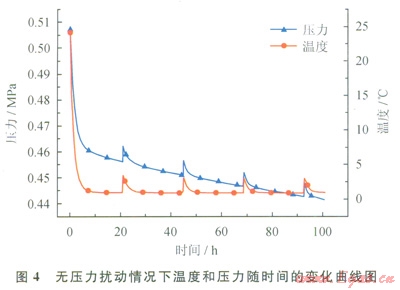 2、3分別分別為無(wú)壓力擾動(dòng)和有壓力擾動(dòng)2種不同的條件下,靜態(tài)純水體系中C3H8水合物的生成過(guò)程圖像。在元壓力擾動(dòng)條件下,實(shí)驗(yàn)開(kāi)始時(shí)向反應(yīng)釜中充入C3H8氣體,使反應(yīng)釜內(nèi)壓力達(dá)劍0.51MPa,在水合物生成過(guò)程中不再補(bǔ)充壓力;而在有壓力擾動(dòng)時(shí),充入C3H8氣體使體系壓力達(dá)到初始值,待體系壓力降低至穩(wěn)定后立即補(bǔ)充C3H8氣體,使反應(yīng)過(guò)程中體系壓力始終維持在0.51MPa。