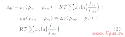 氣體水合反應(yīng)驅(qū)動(dòng)力可定義為氣液系統(tǒng)從某一初始狀態(tài)到另一平衡狀態(tài)的變化過(guò)程中摩爾吉布斯自由能變(Dg)的大小。水合反應(yīng)驅(qū)動(dòng)力是當(dāng)Dg>0時(shí),水合物不能生成或水合物生成速度小于分解速度;當(dāng)Dg<0時(shí),水合物可以生成或水合物生成速度大于分解速度。根據(jù)Sloan[19]給出的等溫氣液系統(tǒng)水合反應(yīng)驅(qū)動(dòng)力公式:
