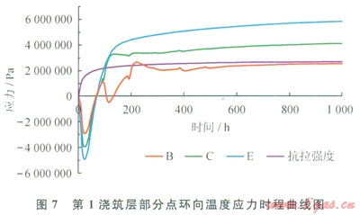 7為第l澆筑層部分點環(huán)向溫度應(yīng)力時程曲線。由圖7可知,在外罐施工期間,混凝土先受壓后受拉,在混凝土澆筑68h后,混凝土由受壓狀態(tài)轉(zhuǎn)變?yōu)槭芾瓲顟B(tài),在混凝土澆筑120h后,第1澆筑層底部某點所受拉應(yīng)力超過了混凝土的抗拉強(qiáng)度,底部混凝土開始產(chǎn)生溫度裂縫。B點應(yīng)力曲線存在上下波動是由于B點易受上層新澆筑混凝土的影響;比較BC、E點應(yīng)力時程曲線可知,混凝土離罐底越近,產(chǎn)生的溫度應(yīng)力越大。