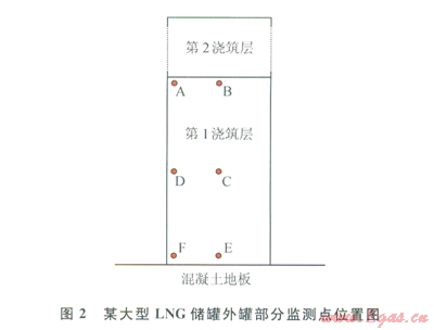以山東某液化天然氣接收站的一個160000m3大型LNG儲罐混凝土外罐為例進(jìn)行數(shù)值計算,混凝土外罐內(nèi)徑為41m,外徑為41.8m,壁厚為0.8m,高為41.1m。混凝土外罐分ll層進(jìn)行澆筑,其中19層澆筑高度為4m,第l0層澆筑高度為l.5m,第ll層環(huán)梁澆筑高度為2.6m,模板采用20mm膠合板,相鄰施工層時間隔為4d。由于結(jié)構(gòu)的對稱性,取罐壁的四分之一(相鄰扶壁柱之部分)進(jìn)行有限元分析(1),外墻地板采用固定端約束,由扶壁柱對外墻的約束,在其兩側(cè)面上施加對稱彈性約束。監(jiān)測點分布位置如圖2所示。