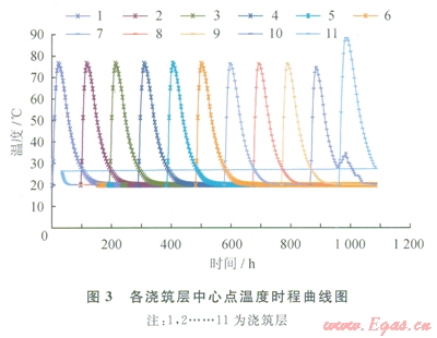 混凝土的內(nèi)部溫度與水泥種類、水灰比、初始條件、邊界條件、熱傳導(dǎo)系數(shù)等有關(guān),還與位置、時間有關(guān),有限元分析時采用式(1)對早齡期混凝土內(nèi)部的溫度場進(jìn)行求解,各澆筑層中心點溫度時程曲線如圖3所示。