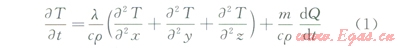 混凝土的熱傳導(dǎo)是一個瞬態(tài)過程,溫度場是齡期和空間函數(shù),混凝土中三維不穩(wěn)定溫度場的熱傳導(dǎo)微分方程為: