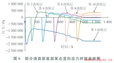 5為各澆筑層底部某點環(huán)向應(yīng)力時程曲線,圖6為部分澆筑層底部某點豎向應(yīng)力時程曲線。由圖5可知,在LNG儲罐外罐施工期間,溫度應(yīng)力分為壓應(yīng)力發(fā)展、壓應(yīng)力轉(zhuǎn)變?yōu)槔瓚?yīng)力及拉應(yīng)力趨于殘余應(yīng)力3個階段。比較圖5和圖6可知,混凝土外罐在溫度及重力荷載作用下,第一主應(yīng)力為環(huán)向應(yīng)力,與彈性力學(xué)理論分析的結(jié)果相符,而且現(xiàn)場施工經(jīng)驗表明混凝土外罐在施工期間底部經(jīng)常產(chǎn)生豎向裂縫。由圖5知,第1澆筑層所受的溫度應(yīng)力明顯大于其他澆筑層,產(chǎn)生這種狀況的原因是第1澆筑層混凝土受到罐底的約束度相對較大;因第39澆筑層澆筑高度及約束狀況相近,所以其應(yīng)力變化曲線相似;第10澆筑層環(huán)向應(yīng)力曲線因受環(huán)梁澆筑的影響而產(chǎn)生2MPa的應(yīng)力波動。
