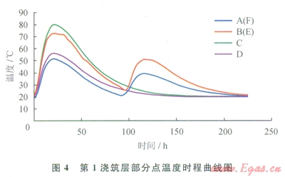 1澆筑層部分點溫度時程曲線如圖4所示。由圖4可知,在外界恒溫條件下,混凝土內(nèi)部溫度在其澆筑約ld后迅速達(dá)到峰值,之后開始緩慢降溫,在其澆筑約10d后趨于穩(wěn)定。由圖4還可知,外罐罐壁厚度中心最高升溫約為60℃,混凝土易產(chǎn)生深層裂縫;混凝土內(nèi)部與表面溫差為25℃,混凝土表面具有開裂的危險;頂部}昆凝土塊內(nèi)部溫度受上層新澆筑混凝土的影響比較大。因此A、B測點在溫度下降階段有2030℃的溫度波動,數(shù)值分析表明,新澆筑混凝土對下層混凝土的影響深度約為1.2m