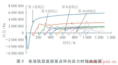 根據(jù)圖3可知,各施工層混凝土內(nèi)部經(jīng)歷了升溫、降溫、趨于穩(wěn)定3個階段,升溫速率明顯大于降溫速率,這種溫度速率變化不一致以及材料參數(shù)隨齡期的變化是產(chǎn)生溫度應(yīng)力的主要原因;由于前9個混凝土的澆筑層高度都為4m,分析的位置也相同,所以其溫度時程變化曲線相似;第10澆筑層溫度曲線出現(xiàn)了2個波峰,其原因是第10澆筑層高度只有1.6m;第11澆筑層因環(huán)梁較厚而產(chǎn)生的溫度峰值大于其他澆筑層,且其達(dá)到峰值的時間相對延遲。